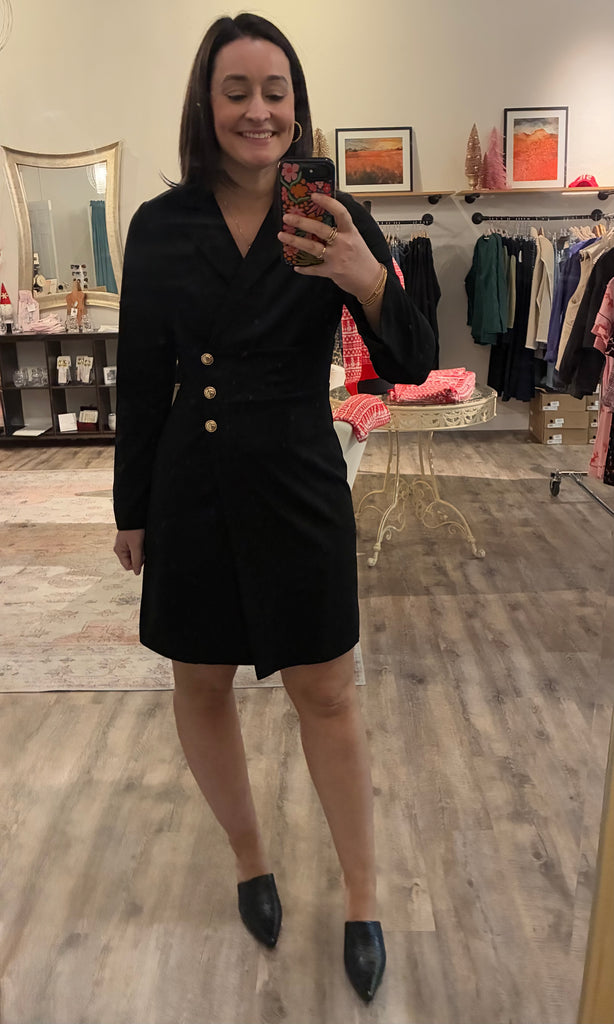 "This Ponte Blazer Dress is perfect for holiday parties. The blazer style adds a touch of sophistication, while the versatile design allows you to pair it with tights and boots or dress it up with heels. Be the best dressed at your next event with this must-have dress."