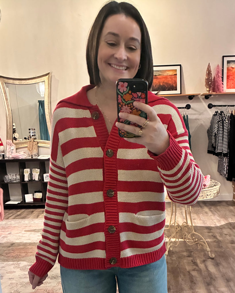 Upgrade your wardrobe with our Stripe Sailor Button Front Sweater. This stylish and comfortable sweater features a classic sailor collar, timeless stripes, and a convenient button up cardigan design. Made to fit true to size, it's the perfect addition to any outfit. Elevate your fashion game with this must-have piece.