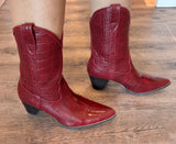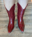 We are obsessed with these boots! The red is gorgeous and they are very comfortable. They pull on and are made from quality man made materials. Fit is true to size.
