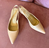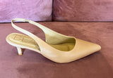 These are the cutest and best closet staple kitten heel pump! They fit great and are very comfortable as well. They are a faux leather and come with an extra pair of replacement heel tap caps! Fit is true to size but if between sizes we’d suggest going up.